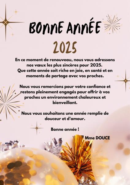 Les Jardins Médicis > Actualités > BONNE ANNEE 2025 BONNE ANNEE 2025 Publiée le 01/01/2025 Nous vous souhaitons, chères familles, une très belle année 2025. Mme DOUCE