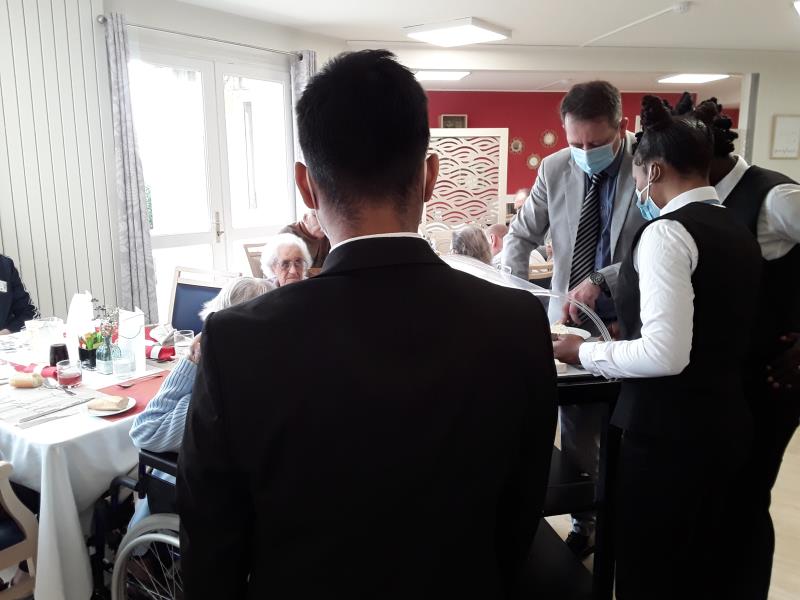 Une ambiance de restaurant étoilé flottait aujourd'hui aux Jardins Médicis. C'est toute une brigade de serveurs et de cuisiniers qui se sont déplacés de leur centre de formation (Stelo - Chanteloup les Vignes) à Mézy. Dirigés par leur professeur, Maître d'hôtel, les tables étaient en fête et le menu particulièrement gourmand, a mis tout le monde en appétit. Je ne résiste pas de vous le faire partager.